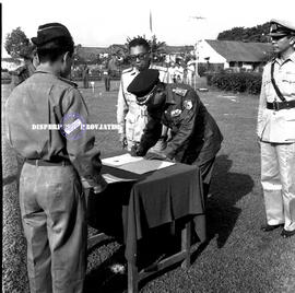 Item VI.63.3274 - Mayor Jendral Basuki Rahmad disaksikan Gubernur Mochamad Wijono dan seorang perwira dari Kepolisian Daerah Jawa Timur melakukan penandatanganan dalam acara peringatan hari Kebangkitan Nasional yang dilaksanakan di Lapangan Tugu Pahlawan Surabaya, 1 – 5 – 1963