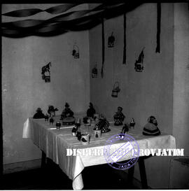 Meja stand berisi hiasan pernik-pernik ruangan dalam acara Ceramah Pekan Kesejahteraan Keluarga (PWKJ), 24 – 10 – 1956