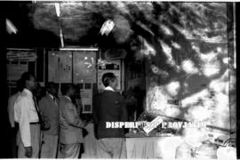 Menteri perdagangan Rachmat Muljomiseno (Kabinet Djuanda / Kabinet Karya, 9 april 1957 – 6 juli 1959), sedang berhenti didepan stan milik kementerian negera urusan transmigrasi dalam menghadiri pameran pemerintah (Center For Economical Fairs of Indonesia) di Surabaya, 2 – 12 – 1958