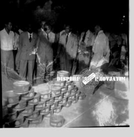 Menteri perdagangan Rachmat Muljomiseno (Kabinet Djuanda / Kabinet Karya, 9 april 1957 – 6 juli 1959), tengah menghampiri sebuah stand yang memamerkan produk olahan kalengan hasil pertanian dalam menghadiri pameran pemerintah / CEFI (Center For Economical Fairs of Indonesia) di Surabaya, 2 – 12 – 1958