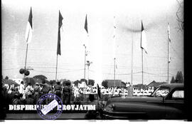 Mobil dinas gubernur Samdikun terlihat parkir di sebelah timur tugu pahlawan saat acara rapat raksasa menuntut pembebasan irian barat di depan kantor gubernuran Surabaya, 10 – 11 – 1957