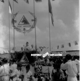 Nampak seorang pejabat / tokoh sedang berorasi pada rapat raksasa PNI (partai nasional indonesia) di Surabaya, 30 – 1 – 1955