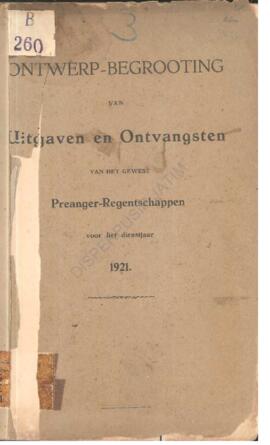 Ontwerp begrooting van uitgaven en ontvangsten van het gewest preanger regentschappen voor het dientsjaar 1921 Rencana anggaran penerimaan dan pengeluaran dari Kabupaten Priangan tahun 1921