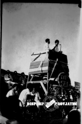 Orasi / sambutan diatas podium / mimbar yang bertuliskan “DP SBC” yang disampaikan pada peringatan HUT Kemerdekaan Republik Indonesia ke 9 di sebuah lapangan di Surabaya, 17 – 8 – 1954