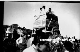 Orasi / sambutan diatas podium / mimbar yang bertuliskan “DP SBC” yang disampaikan pada peringatan HUT Kemerdekaan Republik Indonesia ke 9 di sebuah lapangan di Surabaya, 17 – 8 – 1954