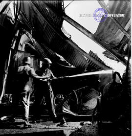 Pada hari sabtu malam minggu pukul 23.40 WIB terjadi kebakaran di Droog Dok Tanjung Perak, petugas kebakaran sedang memadamkan api, 12 Juli 1952