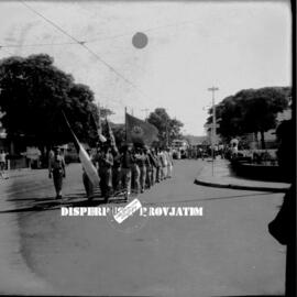 Para barisan dengan membawa bendera PNI mendahului rombongan mobil jenash pada pemakaman ketua umum PNI cabang kota Surabaya Alm. Sidik Djojosoekarto, 9 – 9 – 1955