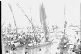 Para nelayan sudah siap-siap diatas kapal untuk melarung sesaji pada acara sedekah laut di Muncar Banyuwangi, 28 – 1 – 1956