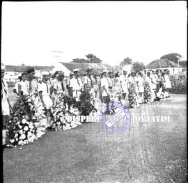 Para pandu dengan rangkaian karangan bunga dalam persiapan Peringatan HUT Kemerdekaan Republik Indonesia ke 11 di Surabaya, 17 – 8 – 1956