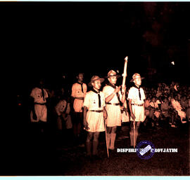 Para pandu laki-laki sedang membawa obor malam peringatan hari Boden Powell di Surabaya, Tanggal, 22 – 2 - 1951