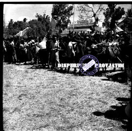 Para panitia tengah mempersiapkan pasangan sapi kerpan di garis start dalam lomba kerapan sapi di madura, TT