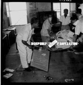 Para pegawai Djapen Djatim/Japen Jatim. (Djawatan Penerangan Djawa Timur) sedang melakukan kegiatan kerja bhakti dalam peringatan 17 Agustus 1958 di Surabaya, 17 – 8 – 1958