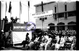 Item VI.57.2120 - Para pejabat dan perwira dari angkatan bersenjata yang hadir dalam rapat raksasa menuntut pembebasan irian barat di depan kantor gubernuran Surabaya terlihat duduk di samping podium, 10 – 11 – 1957