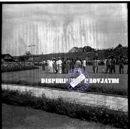 Para pejabat dan perwira sedang persiapan untuk meletakkan karangan bunga di tugu pahlawan pada Peringatan HUT Kemerdekaan Republik Indonesia ke 11 di Surabaya, 17 – 8 – 1956