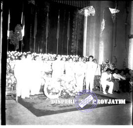 Para pejabat sedang memberikan sambutan pada resepsi malam peringatan ulang tahun RRT (Republik Rakyat Tiongkok) di Surabaya, 1 – 10 – 1955