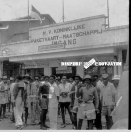 Para pekerja Koninklijke Paketvaart Maatschappij (KPM) (perusahaan pelayaran yang mempunyai kedudukan hukum di Amsterdam bergerak dalam bidang pelayaran ini beroperasi mulai dari tahun 1888. Pada 3 Desember 1957, KPM diambil alih aksi buruh, yg kemudian dinasionalisasi oleh pemerintah RI : wikipedia) berkumpul didepan kantor pada aksi pemogokan (kampanye pembebasan irian barat) di Surabaya, 2 – 12 – 1957