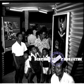Para pengunjung pameran sedang mengunjungi stand pameran milik Djawatan Penerangan pada Pekan Raya Surabaya ke – 33, 25 – 8 – 1956
