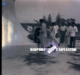 Para pengurus /panitia Kongres GMNI (Gerakan Mahasiswa Nasional Indonesia) sedang meletakkan karangan bunga di tugu pahlawan Surabaya, 18 – 11 - 1954