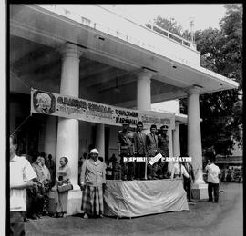 Item VI.64.3536 - Para perjabat dan perwira berdiri di panggung kehormatan untuk memberikan hormat kepada barisan pembawa bendera pada upacara penganugrahan gelar pahlawan nasional K.H. Hasyim Asj’ari dan Soerjo mantan Gubernur Jawa Timur di Gedung Negara Grahadi, 21 – 12 – 1964