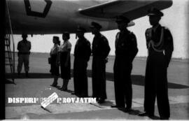Para perwira bersiap menyambut kedatangan Presiden Sukarno di Lapangan terbang Morokrembangan, ketika akan menghadiri acara pekan irian barat dan rapat raksasa di Surabaya, 10 – 11 – 1957