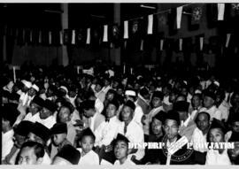 Para peserta laki-laki pada Kongres Nahdlatul Ulama (NU) di Surabaya, tampak dibelakang samar-samar terlihat tulisan kontingen dari djawa barat, 8 – 9 – 1954