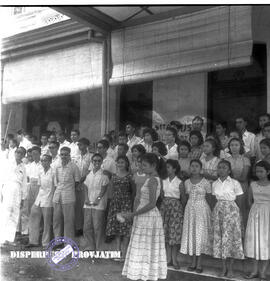 Para peserta upacara mengheningkan cipta pada acara penyerahan Simpang SOS yang di selenggarakan di Balai Kota Surabaya, tahun 1957