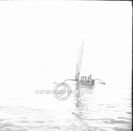 Para rombongan pejabat sedang naik perahu layar, sedang menikmati suasana pantai pada saat pembukaan tempat pariwisata pantai pasir putih situbondo, 14 – 8 – 1955