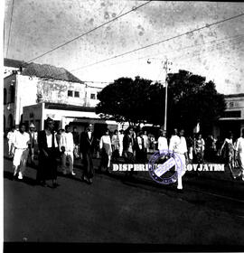Item VI.60.3019 - Parade pemuda dengan memakai pakaian daerah peringatan Hari Kemerdekaan Republik Indonesia ketika melintas di depan Hotel Sarkies Surabaya, 17 – 8 – 1960