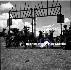Pasangan sapi kerapan dengan no urut 1 dan 2 ketika berada di garis start pada kerapan sapi di Pamekasan, 7 – 10 – 1956