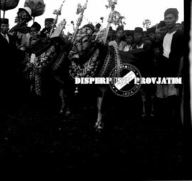 Pasangan sapi kerapan tengah berada di lapangan pada kerapan sapi di Pamekasan, 7 – 10 – 1956