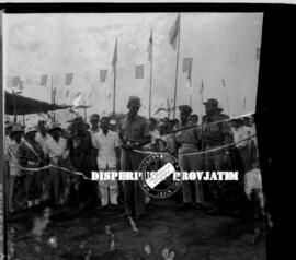 Pengguntingan pita oleh seorang pejabat / perwira dalam acara pembukaan kerja bhakti dalam rangka memperingati hari sumpah pemuda, 23 – 10 – 1958