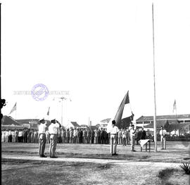 Pengibaran bendera pada upacara peringatan Hari Maritim di depan kantor Gubernuran Surabaya, 21 – 8 – 1963