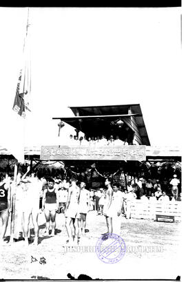 Pengibaran bendera yang dilakukan oleh atlit di depan panggung kehormatan pada acara ulang tahun RRT (Republik Rakyat Tiongkok) di Surabaya, 1 – 10 – 1955