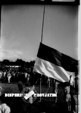 Pengibaran sang merah putih dalam upacara peringatan HUT Kemerdekaan Republik Indonesia ke 9 di sebuah lapangan di Surabaya, 17 – 8 – 1954