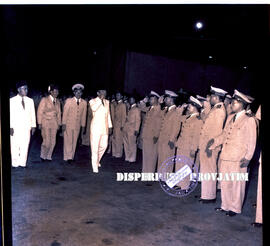 Penyambutan kedatangan presiden soekarno di lapangan terbang Morokrembangan dalam rangka menghadiri Rapat Akbar Masyumi, para perwira kepolisian sedang menyambut kedatangannya, 26 s.d 27-12 – 1954