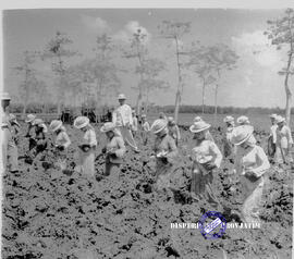 Item III.H.TT.2020 - Perkebunan gula. Para pekerja perkebunan terlihat ibi-ibu sedang melakukan penanaman tebu dan diawasi oleh mandor/pengawas perkebunan