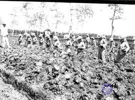 Perkebunan gula. Petani sedang menanam bibit tebu dengan diawasi oleh mandor/pengawas perkebunan dan sekaligus memberikan pengarahan kepada para petani tebu.