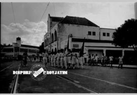 Peserta gerak jalan dalam peringatan hari “student day” ketika melintas di depan Hotel Sarkies jalan embong malang (Gubernur Moerdjani dan Wakil Gubernur Doel Arnowo, serta beberapa pejabat Pemprov Jatim ditangkap. Mereka dibawa ke Surabaya dan ditawan di Hotel Sarkies. Hotel ini sudah dibongkar, letaknya di dekat Hotel Tunjungan sekarang) di surabaya, 20 – 11 – 1955