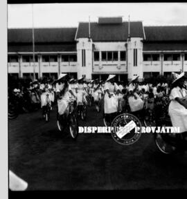 Peserta karnaval sepeda hias ketika melintas di depan balaikota Surabaya pada peringatan hari ibu di surabaya, 22 – 12 – 1954