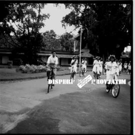 Item VI.54.0673 - Peserta karnaval sepeda hias ketika memasuki halama gedung negara grahasi pada peringatan hari ibu di surabaya, 22 – 12 – 1954