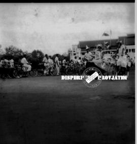 Peserta karnaval sepeda hias pada peringatan hari ibu ketika melintas di depan balai kota surabaya, 22 – 12 – 1954