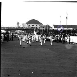 Peserta pawai dari PELNI saat melintas di depan kantor Gubernuran pada peringatan Hari Maritim Surabaya, 21 – 8 – 1963