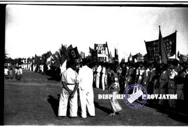 Peserta upacara dari berbagai lapisan masyarakat dan pemuda dengan membawa berbagai macam spanduk dan tulisan pada peringatan HUT Kemerdekaan Republik Indonesia ke 9 di sebuah lapangan di Surabaya, 17 – 8 – 1954