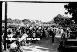Peserta upacara dari berbagai lapisan masyarakat dan pemuda dengan membawa berbagai macam spanduk dan tulisan pada peringatan HUT Kemerdekaan Republik Indonesia ke 9 di sebuah lapangan di Surabaya, 17 – 8 – 1954