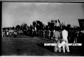 Peserta upacara dari berbagai lapisan masyarakat dan pemuda pada peringatan HUT Kemerdekaan Republik Indonesia ke 9 di sebuah lapangan di Surabaya, 17 – 8 – 1954