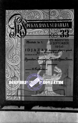 Piagam penghargaan Hadian ke – I untuk stand pameran milik Djawatan Penerangan pada Pekan Raya Surabaya ke – 33 yang diselenggarakan pada tanggal 25 agustus sampai dengan 9 september 1956, 25 – 8 – 1956