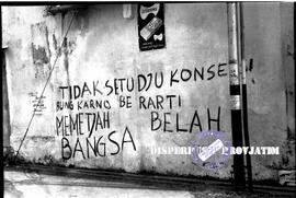 Plakat-plakat tentang konsepsi Bung Karno (Presiden Sukarno) di sebuah tembok dengan tulisan “tidak setuju Konsepsi Bung Karno Berarti memecah belah bangsa” di Surabaya, tahun 1957