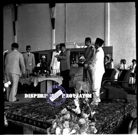 Item VI.57.2108 - Presiden Sukarno sedang memberikan aplaus dengan disaksikan oleh Presiden Sukarno, Gubernur Samadikun dan Panglima Tentara Teritori Wilayah V dalam acara pekan irian barat di Surabaya, 10 – 11 – 1957