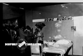 Presiden Sukarno / Soekarno didampingi para pejabat ketika meninjau eksposisi / pameran PMI (Palang Merah Indonesia) di Surabaya, 9 – 2 – 1959