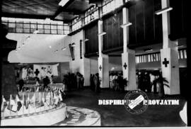 Presiden Sukarno / Soekarno didampingi para pejabat ketika meninjau eksposisi / pameran PMI (Palang Merah Indonesia) di Surabaya, 9 – 2 – 1959